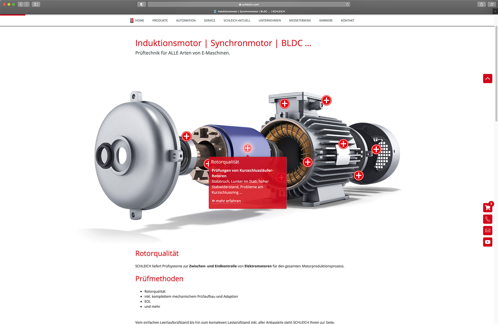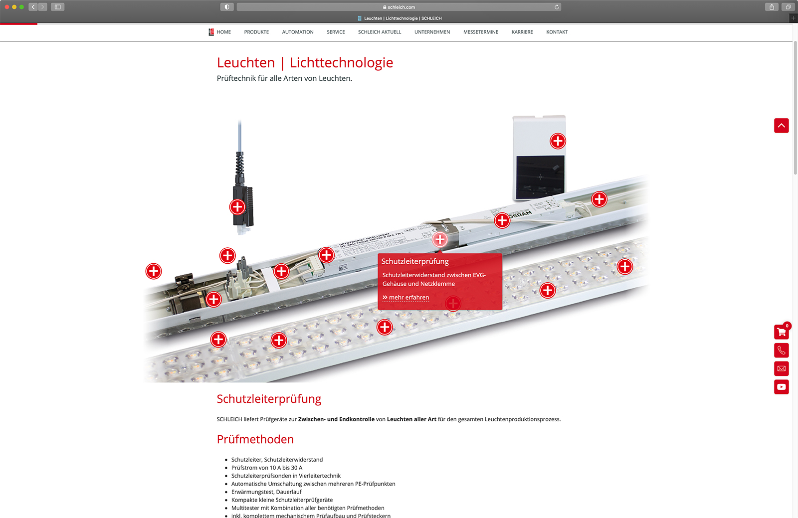 Mit einem Klick gelangen die Besucher der Website von der Startseite auf die entsprechende Landingpage. Über die interaktiven Hotspots in den Illustrationen bzw. Fotos erhalten die Besucher einen schnellen und umfassenden Überblick über die vielfältigen Prüflösungen von SCHLEICH für den jeweiligen spezifischen Anwendungsbereich.